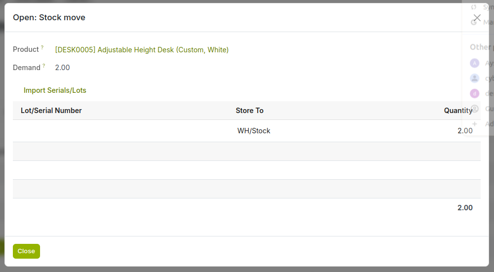 It will open a wizard to add the lots or serial numbers. You can select the lots in the field Lot/Serial Number.