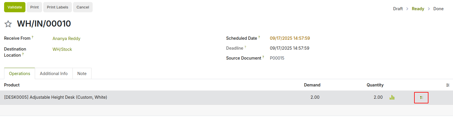 In your operation lines, you can add the lots of received products. Click on the icon in the image below.